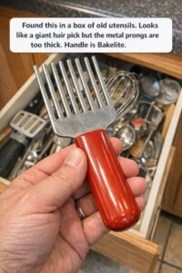 Found this in a box of old utensils. Looks like a giant hair pick but the metal prongs are too thick. Handle is Bakelite.